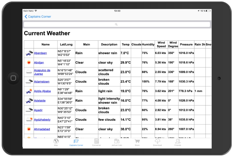 In the Captains Corner you'll find many useful tables, lists, diagrams and calculators. The lists/ tables are searchable.